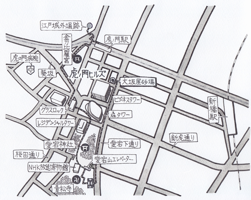 町のエリアは、〈虎ノ御門〉を北限として、東は〈幸橋御門〉まで、西は〈愛宕山〉あたり、南は〈増上寺〉の手前までです。町名としての〈虎ノ門〉を厳密に見ればもう少し広いですが、だいたい網羅しています。とにかく今回はこのあたりを散歩しましょう。
