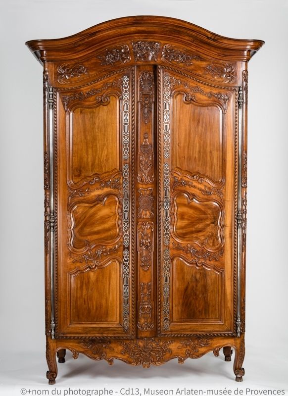 洋服箪笥(大型ワードロープ)にあるらせん状の装飾は、特に18世紀に流行し、「クタール様式」(エスカルゴのプロヴァンス語)あるいはプロヴァンス家具の発祥地にちなんで「フルク様式」と呼ばれる。洋服箪笥は結婚式の際に花嫁の両親が持参金の一部として持たせたもので、花婿の両親はその金具類を贈るのが習わしだった。箪笥の中にはおそらく、大切な行事の際に用いる礼服やバッグ、帽子、子ども服など様々な衣類が思い出とともに詰め込まれていたに違いない。こうした箪笥は、ときに高値で売りに出されることもある。はたして新たな思い出が詰め込まれる日は来るのだろうか――。
