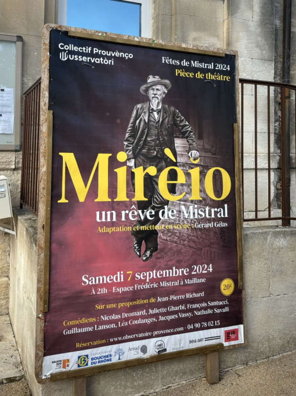 ところで、2024年は、3つの意味でプロヴァンスにとって特別な年であった。ミストラルのノーベル文学賞受賞120周年、ミストラル没後110周年、そしてフェリブリージュ創設170周年である。これを記念して制作されたのが、戯曲『ミレイユ――ミストラルの夢』だ。監督はジェラール・ジェラスが務めた。戯曲「ミレイユ」も、アヴィニョンやマイヤンヌなどのミストラルゆかりの地を中心に上演された。