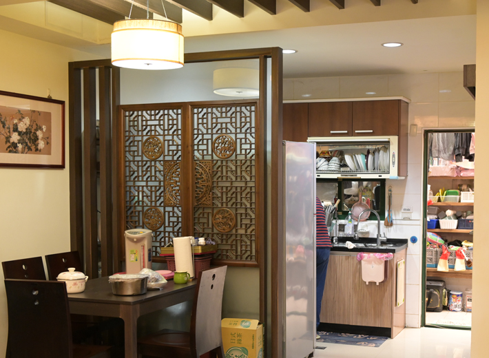 後陽台(半屋外の洗濯機、物干しなどがあるドライスペース)まで真っすぐに続きます。この一直線に続く間取りは台湾の家によく見られる造りです。暑くて湿度の高い時期が長い台湾では、室内で快適に過ごすために部屋を壁で遮らず、風通しよい構造にする工夫が施されているのです。