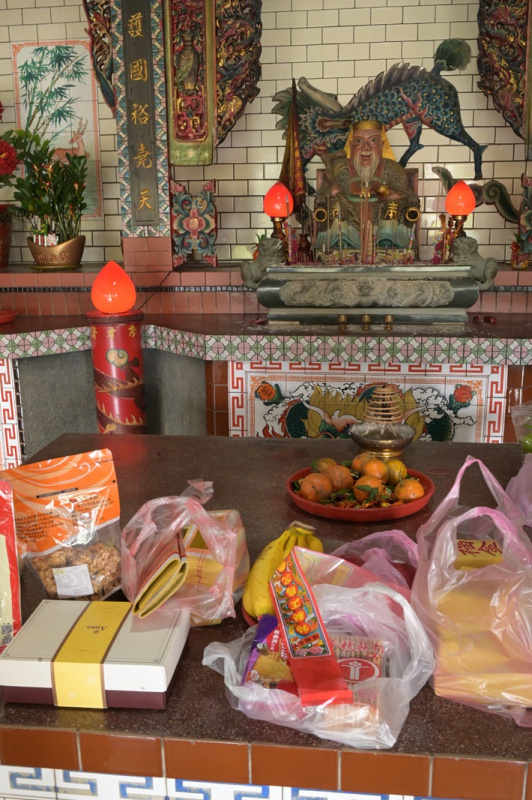 祀られている小さな廟へ向かうと、そこにはお菓子や果物が山のように供えられていました。「土地公は甘いものが好きなのよ」とシュウユさんは笑いながらお菓子の袋を供え、静かに手を合わせ、