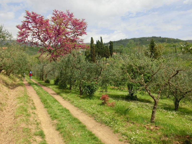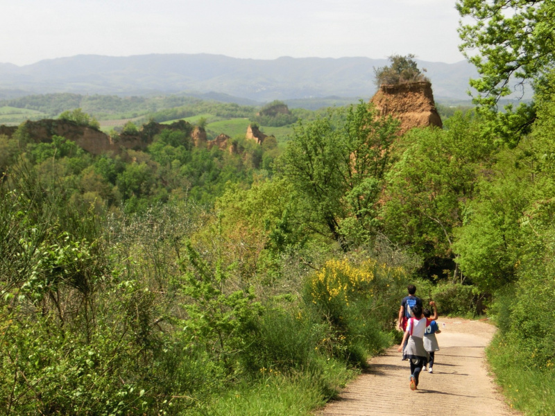 まだまだ元気いっぱいの青年グループは颯爽と再出発していきましたが、私たちはゆるやかな上りが続く復路の硫黄水コースに備えて、十分に休憩をとってから歩き始めました。目の前に広がるバルツェの風景は、アメリカのグランドキャニオンか、あるいはオーストラリアの大渓谷かと錯覚してしまうほどです。けれども道中のアグリツーリズモ(農園宿泊施設)や糸杉、オリーブ畑といったトスカーナらしい景色と混じり合い、いったい自分はどこにいるのかが分からなくなるような妙な感覚になるのでした。