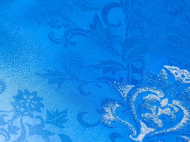 続いて青地の綸子(りんず)の着物を選びました。綸子は地紋が浮き出ている光沢のある生地で、滑らかな手触りが特徴です。この着物は、唐草のような模様をところどころ銀糸で織り込んでいるのが美しいと思います。帯は縁起のよい花七宝柄を意匠した袋帯です。高級感のある着物を華やかに彩ってくれます。