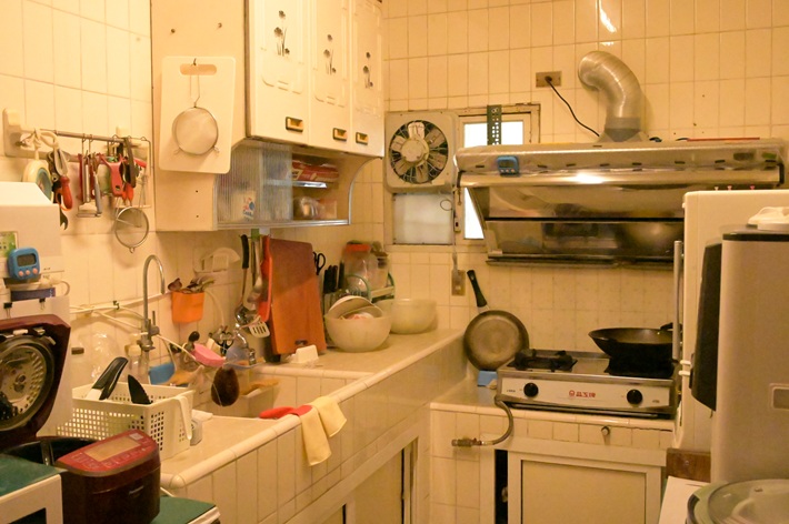 平日はウーヤオさんとリールーさんの夫婦二人でここに暮らしていますが、週末になるとリディアさん含む、きょうだいとそれぞれの家族が集まり、家はにぎやかになるそうです。この日も週末だったのでリディアさんとリディアさんの兄、そして妹がそろっていました。台所に入ると、38年も前から使われている台所とは思えないほど、床も壁も真っ白なタイルで囲まれ、まるで理科実験室のよう。料理をすると油や汚れが飛び散るので白は敬遠されがちだと思っていましたが、むしろ白だからこそ汚れが目立ち、掃除すべき場所がわかるわけです。この台所の清潔さを見て考えを改めました。