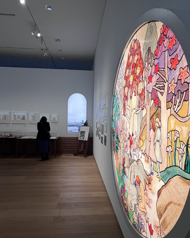 土曜日の早朝から展覧会会場はすでにたくさんの人で賑わっていました。東京を皮切りに巡回中の同展覧会、壁画やムーミンの線画を元にしたアニメーションなどの素敵な演出はそのまま。多くの人々がトーベの壁画作品(複製)や油彩作品を食い入るように見つめていたのが印象的でした。