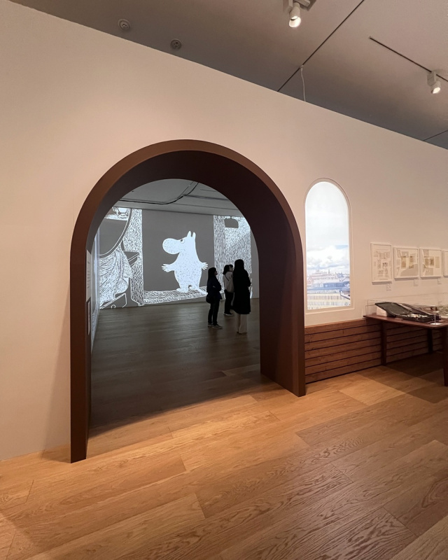 会場は2階入口から1階へと抜けていく構成で、ゆったりとした空間が魅力的です。特設ショップでは、トーベ・ヤンソンが暮らした島に滞在した体験を綴った拙著『トーベ・ヤンソンの夏の記憶を追いかけて』も取り扱っていただいていて、実際に手に取ってくださる方の姿を見つけると、胸が温かくなりました。