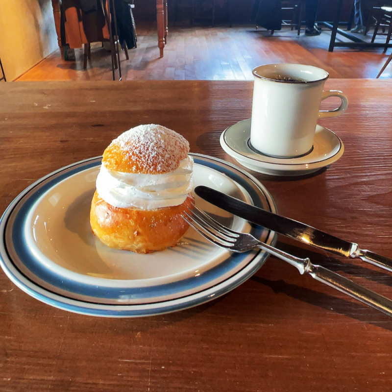 この週末は展覧会の他に、近くの雑貨屋店「risette」で北欧ヴィンテージの販売と自家焙煎の珈琲を手がける店「istut」による、フィンランドポップアップカフェも開催されていました。フィンランドポップアップカフェのメニューには、フィンランドで2月の謝肉祭の期間に食べられる伝統的なお菓子「ラスキアイスプッラ」とシナモンロールが登場。ラスキアイスプッラは生地にカルダモンを練り込んだパンに、ジャムやアーモンドクリーム、ホイップクリームを挟んだもので、隣国スウェーデンでは「セムラ」と呼ばれています。キリスト教のイースターの断食に備えてカロリーを取るために生まれたお菓子なのでかなりハイカロリーですが、この時期でないと食べられないレアな絶品スイーツなのです。