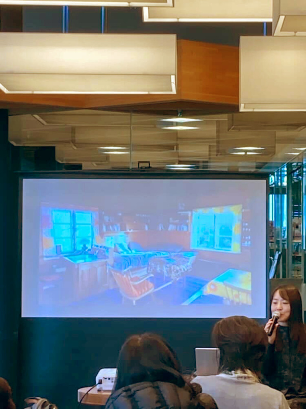 島に立つ小屋の写真をスクリーンに投影しながら進めたトークの様子
