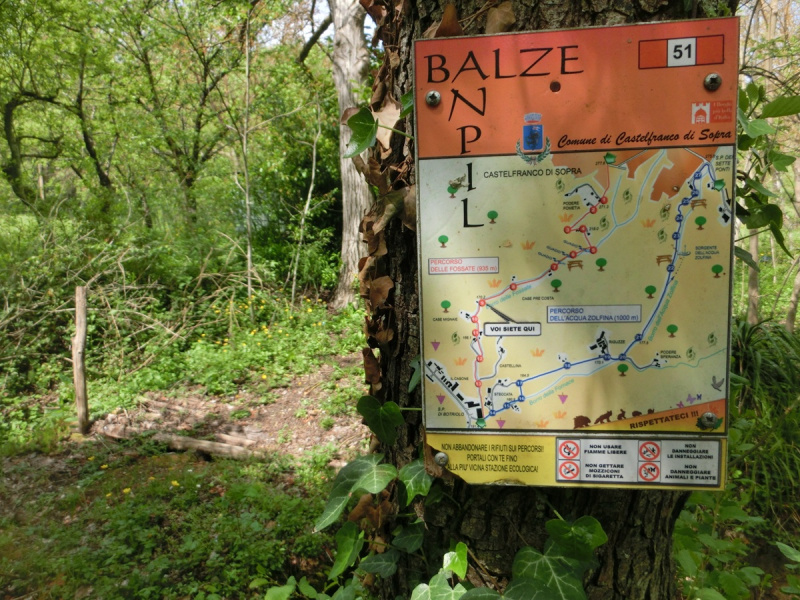 目的地はバルツェ自然保護エリア内にあるイタリア・アルペン・クラブのトレッキングコース51番。通称「堀コース」と「硫黄水コース」から成る全長約6キロのコースです。難易レベルは低く、所要時間は2時間と短めで、初心者で小さな子ども連れの私たちにはピッタリです。さらに両コースを通して歩く場合、出発点と到着点がどちらも「イタリアの最も美しい村」協会※に加盟している村、カルテルフランコ・ディ・ソプラというのも村好きの私にとってはうれしいことです。その日はお昼前に城壁の外に車を止め、村の城門からバルツェ通りを抜けて往路の堀コースから歩き始めました。